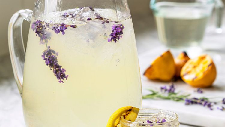 Juice the lemon halves. In a pitcher combine the lemon juice, syrup, and remaining water. Chill until needed. Serve over ice topped off with sparkling water and with additional rosemary and lavender, if desired.